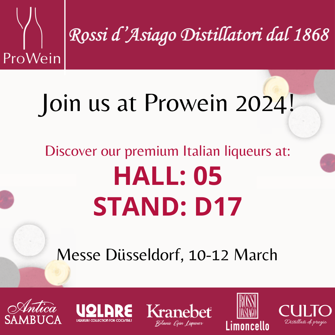 Rossi d’Asiago vi aspetta a Prowein 2024 22 Gennaio 2024 Siamo lieti di annunciarvi la nostra partecipazione a Prowein 2024, una delle più importanti fiere di portata internazionale del vino e degli spiriti che si terrà dal 10 al 12 Marzo a Düsseldorf. Saremo presenti con i nostri brand di punta: Antica Sambuca, Volare Liqueurs for Cocktails, Kranebet Botanic Gin Liqueur, Limoncello Rossi d’Asiago e Grappa Culto, in uno stand progettato per evidenziare l’identità distintiva dei nostri brand, offrendo un ambiente accogliente e professionale per incontri significativi. Questa fiera è la piattaforma ideale per presentare i nostri prodotti, far assaggiare ai visitatori i nostri marchi in portafoglio ed esplorare nuove prospettive di collaborazione nel settore. Scopri i nostri marchi protagonisti a Prowein: Antica Sambuca: Antica Sambuca è un liquore italiano dolce e naturale ottenuto dalla distillazione di un infuso di stelle di anice e una miscela di oltre 17 erbe e spezie selezionate. Un’esperienza sensoriale che rappresenta l’autentica tradizione italiana in ogni goccia. Volare Liqueurs for Cocktails: La linea Volare è pensata per la mixology, offrendo una vasta gamma di 38 liquori di alta qualità che aggiungono un tocco distintivo a ogni cocktail. Kranebet Botanic Gin Liqueur: emblema della distilleria Rossi d’Asiago che quest’anno compie 100 anni, Kranebet è ottenuto dalla meticolosa distillazione a bagno-maria delle bacche di ginepro ed altre botaniche selezionata. 100% Made in Italy e naturale sorprende i palati moderni con il suo inconfondibile profilo aromatico. Limoncello Rossi d’Asiago: un liquore autenticamente italiano la cui fragranza è ottenuta dalla macerazione in alcool delle migliori scorze di “Limone di Siracusa IGP”. Un limoncello Made In Italy, vegan e gluten free dall’avvolgente aroma agrumato e dal profilo fresco e fruttato. Grappa Culto: è una collezione di grappe italiane sapientemente invecchiate che si distinguono per aromi e sentori di grande finezza. Vi aspettiamo presso il nostro stand, situato nella Hall 05, Stand D17. Per fissare un appuntamento inviare un’email a : exp@rossidasiago.com